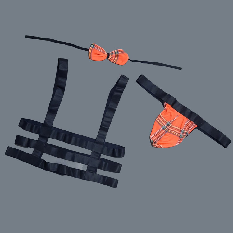 شورت کلاسیک: این شورت با پارچهای با زمینه قرمز و خطوط راهراه مشکی، سفید و سرمهای طراحی شده که شبیه به پارچههای کلاسیک دانشآموزی است. این طراحی به کاستوم جلوهای جذاب و خاص میدهد. 🔴⬛⬜