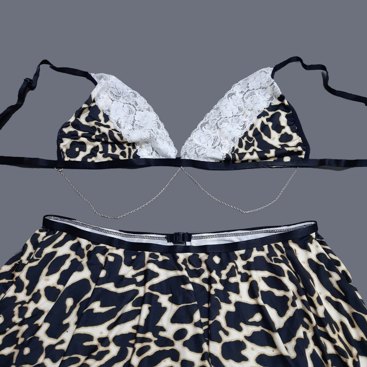 سوتین این ست با کاپهای پلنگی و دانتل سفید بالا، توجه را مستقیماً به فرم سینهها جلب میکند. کشهای مشکی و زنجیر هلالی بین دو کاپ، نه تنها جلوهای جذاب به آن میدهد، بلکه حس لوکس و مدرن را به لباس افزوده است. بندهای قابل تنظیم نیز راحتی و فیت مناسب را تضمین میکنند.