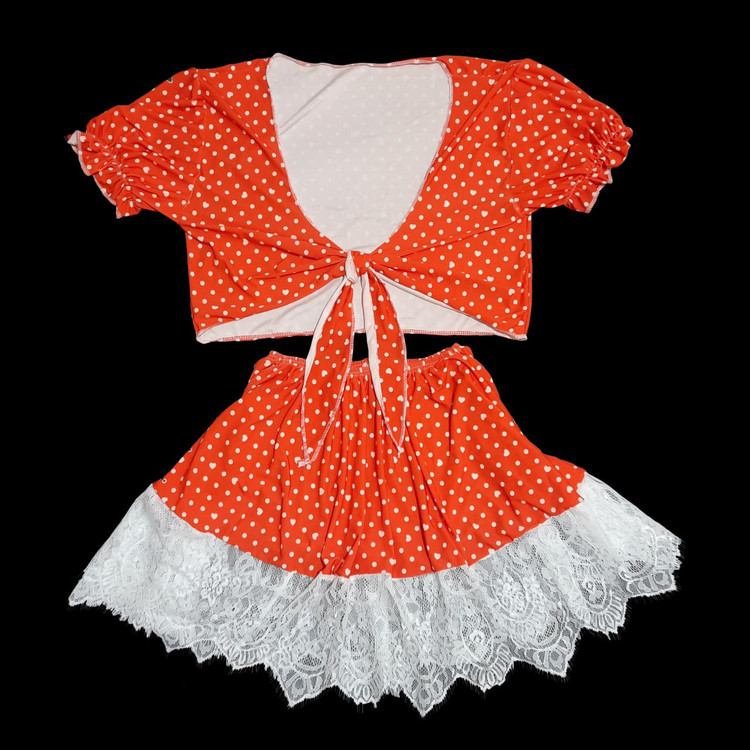 ساختار دو تکه این کاستوم شامل یه بالاتنه کراپی با طراحی خاصه که خط و حجم سینهها رو با ظرافت نشون میده. آستینهای کوتاه چیندار با کش لطیف، یه حس دخترونه و بازیگوش به کل استایل میدن.