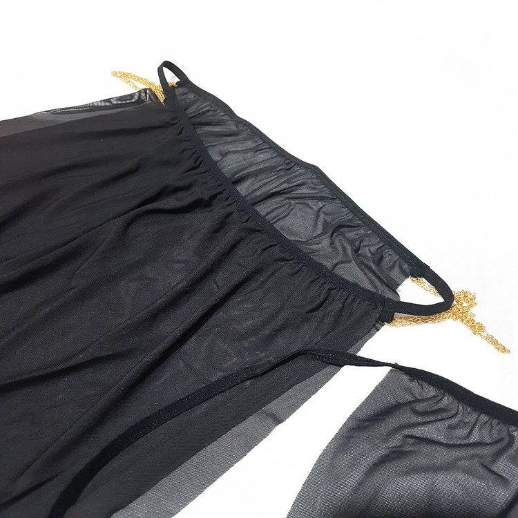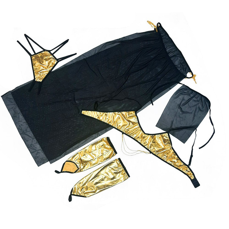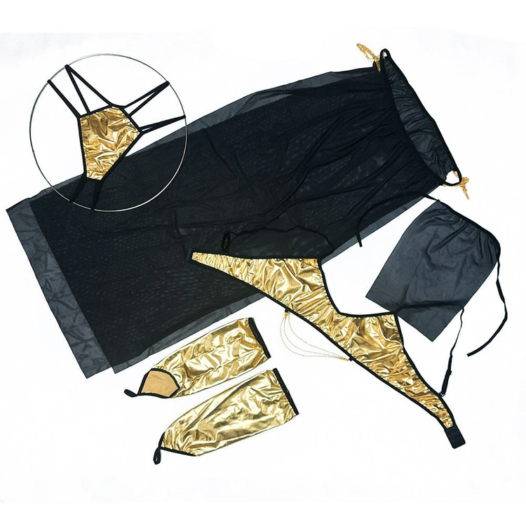 این ست با طراحی باز در نواحی پاها، باسن، بازوها و بخشی از سینه، تمرکز را بر خطوط منحنی بدن قرار میدهد. دامن تور با برشهای کناری، پاها را برجسته میکند و زنجیرهای طلایی روی شکم و رانها، حرکت بدن را به زیبایی نمایش میدهند.