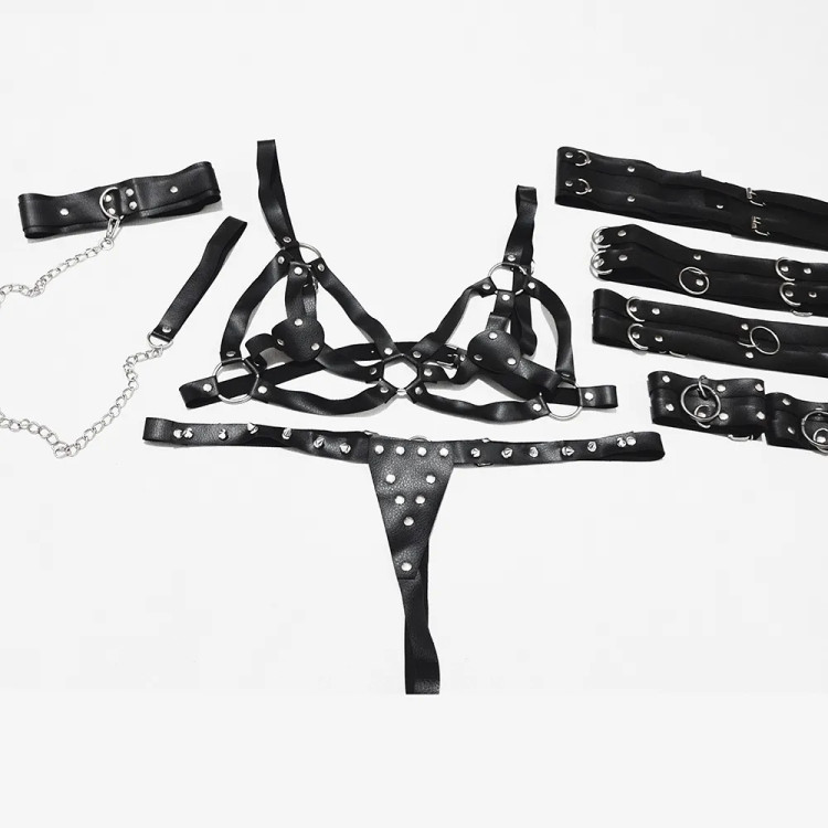 این ست با کاپهای باز سوتین و عناصر اتصالی، بر منحنیهای طبیعی سینه و کمر تأکید دارد و با رانبندها و مچبندها، خطوط کشیده پاها و دستها را برجسته میسازد. حلقه گردن ظریف، توجه را به گردن و شانهها جلب میکند، در حالی که کمربند، فرم شکم را به شکلی هنری قاب میگیرد – همه برای نمایش هارمونی بدن با ظرافت.