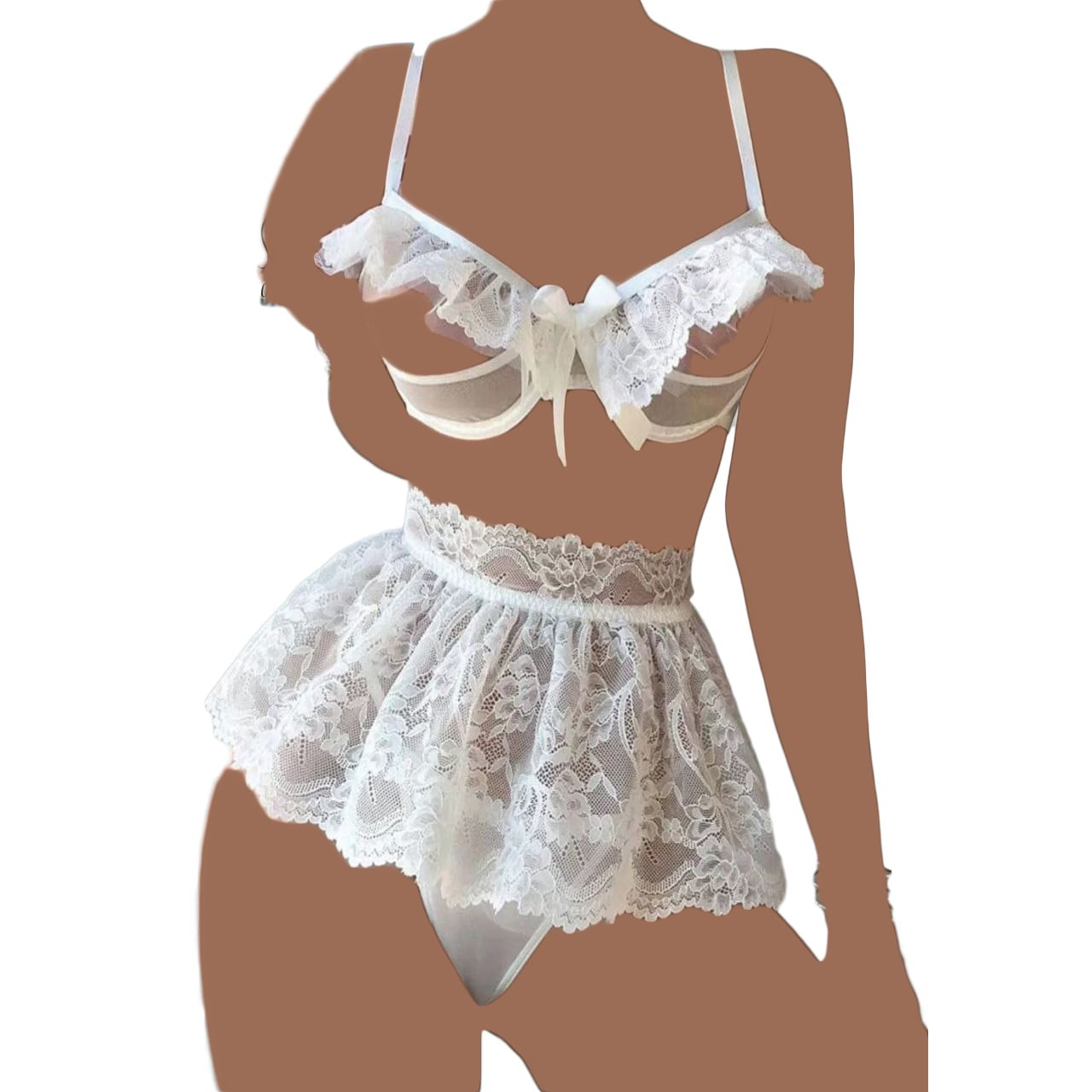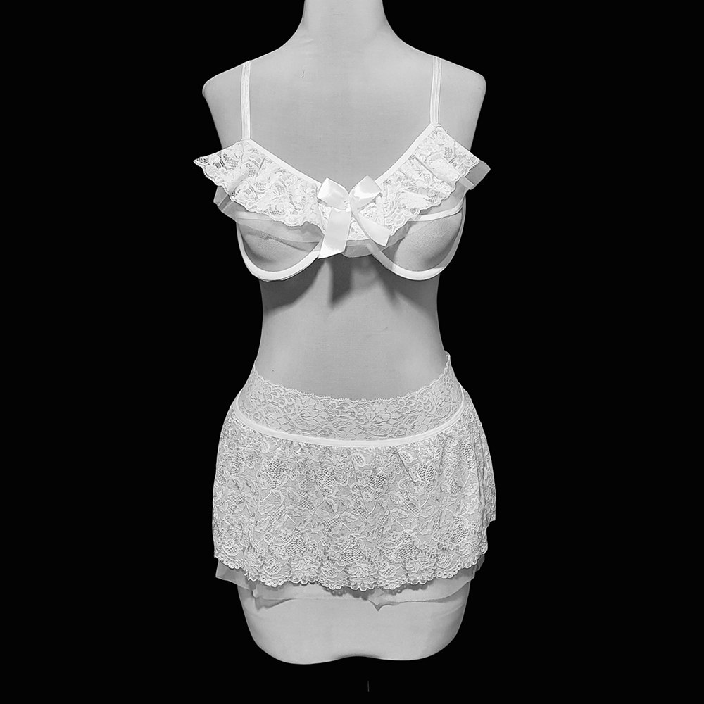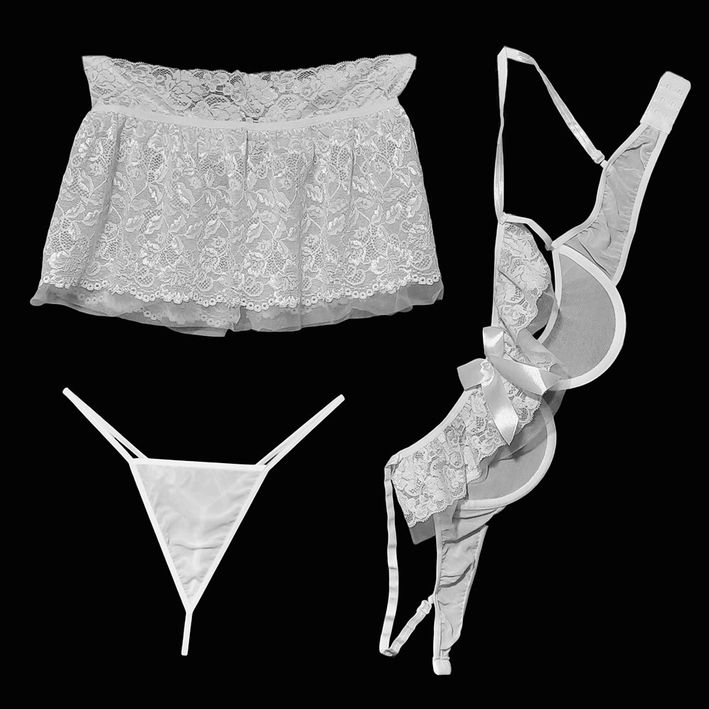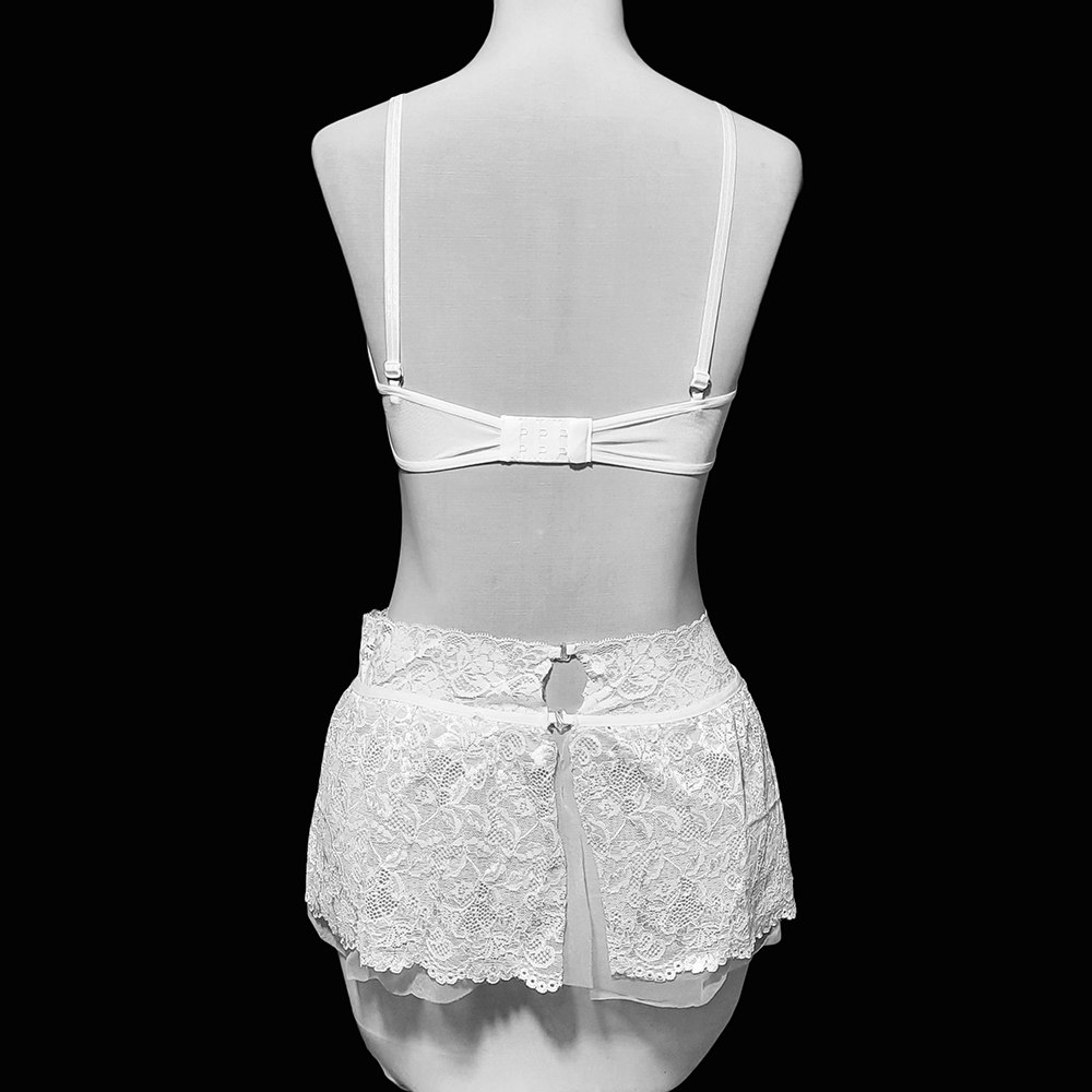 شورت لامبادای مثلثی 🤍 همراه این ست، یک شورت لامبادای مثلثی سفید ارائه میشود که در جلو پوشش توری دارد و در پشت با کمترین پوشش ممکن (یک کش نازک)، باسن را کاملاً آزاد میگذارد تا جلوهگری دامن پشت باز تکمیل شود.
