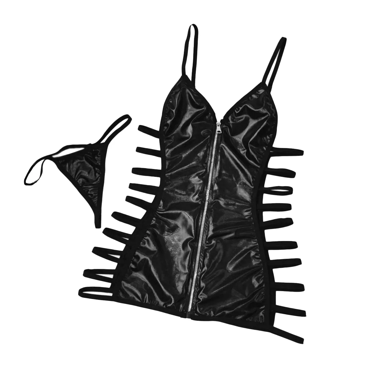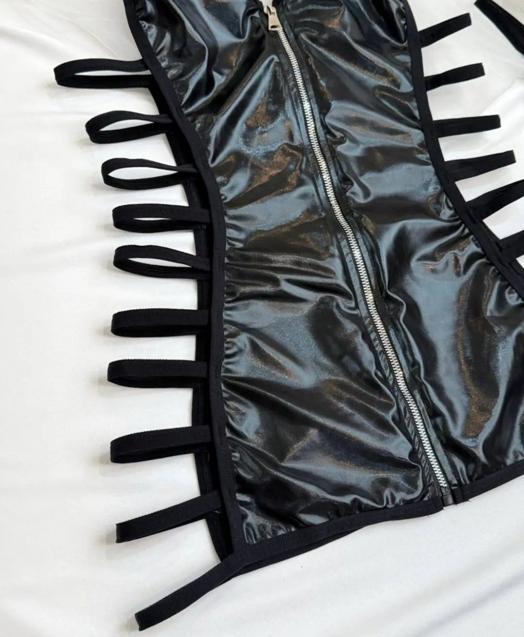 دو طرف لباس کاملاً باز بوده و با بندهای نردبانی باریک پوشش داده شده است.