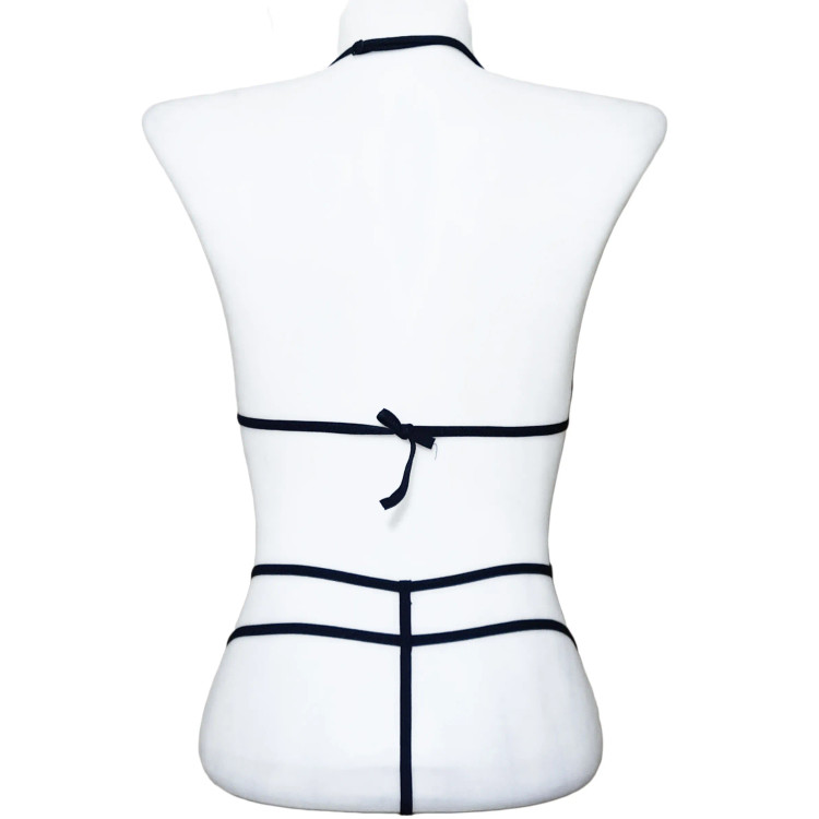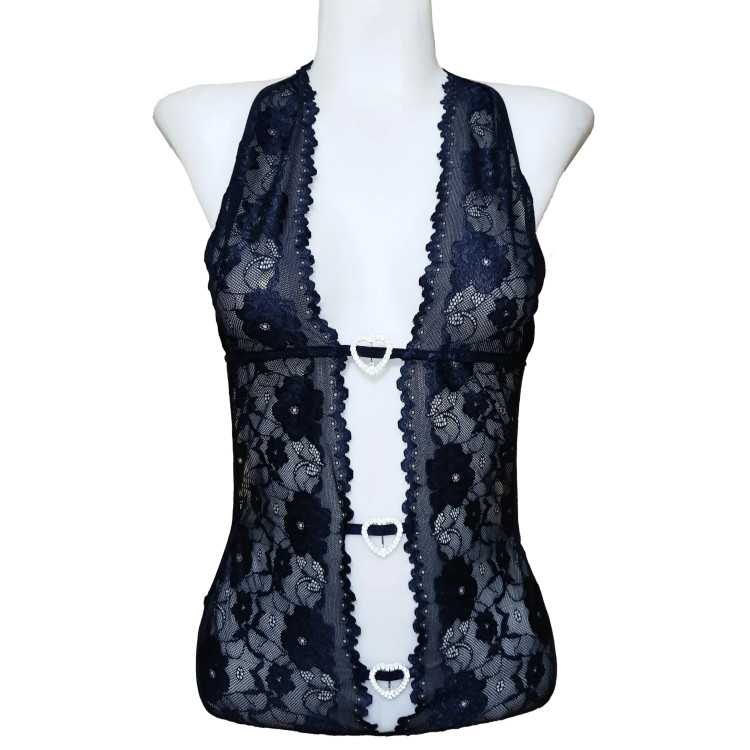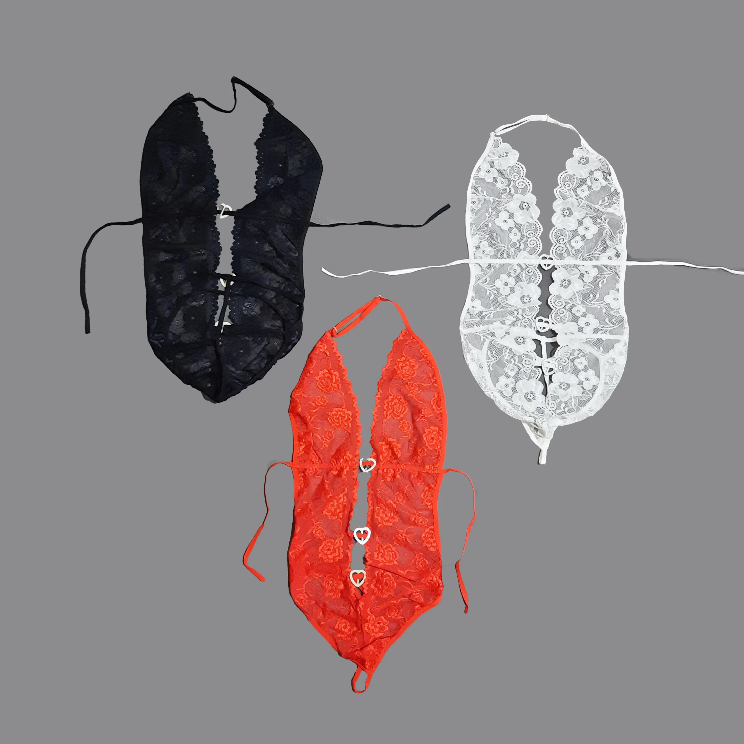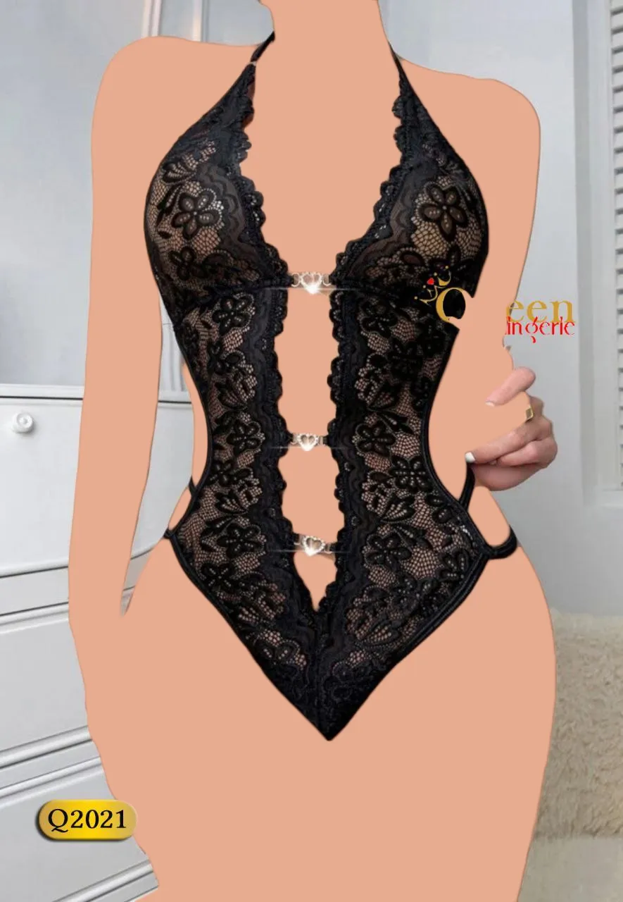 این بادی پوشش پاها را حذف کرده تا تمرکز کامل روی شکم، سینهها، کمر و باسن باشد. طراحی قلبی شکل بین دانتلها در قسمت شکم و سینه، باعث میشود این نواحی مرکز توجه باشند. همینطور بندهای پشت و کشهای نرم با پوشش حداقلی، فرم بدن را به شکلی طبیعی و جذاب نمایش میدهند.
