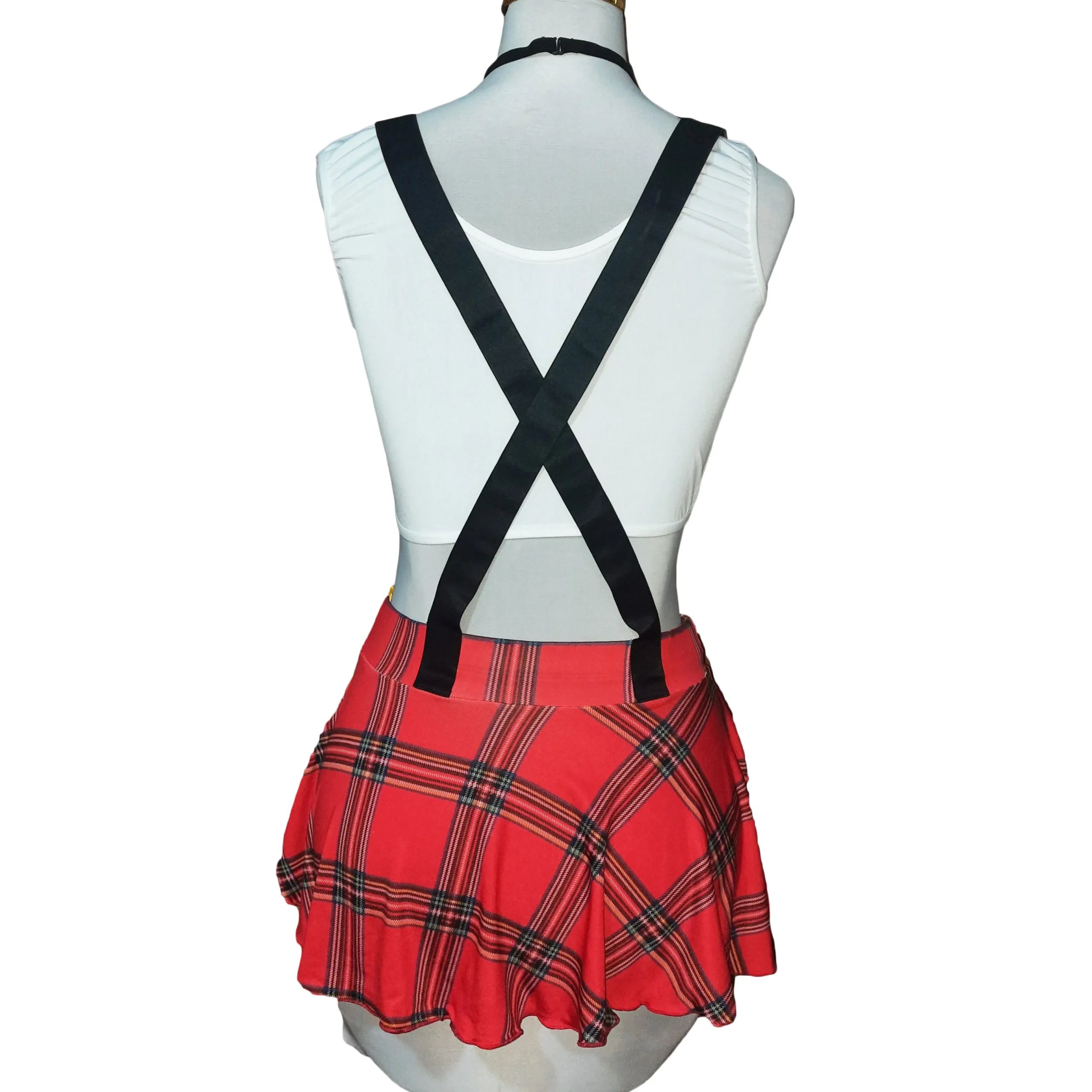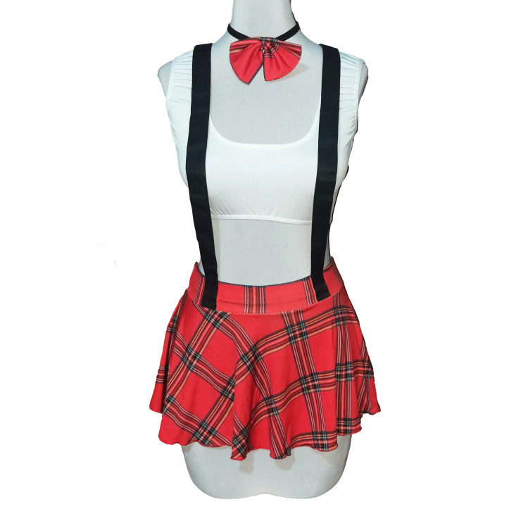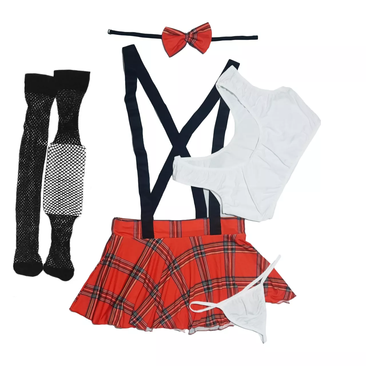 این کاستوم شامل پنج تکه جذاب است: نیمتنه سفید بدون آستین، دامن چیندار با طرح پارچه مدرسهای، دوبنده ساسبندی که به صورت ضربدری در پشت قرار میگیرد، یک جوراب زنبوری (فیشنت) تحریککننده، و یک شورت لامبادای سفید. ترکیب این اجزا، ظاهری منحصربهفرد و هماهنگ پدید آورده که توجه را دقیقاً به همان جاهایی جلب میکند که باید!