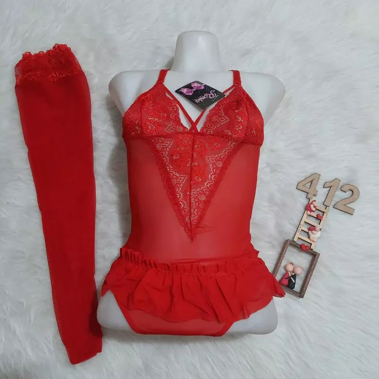 باز هم ترکیب تور و دانتل و هارنس و باز هم یک کد پرفروش دیگر! الگوی طراحی این کد با کد 411 تفاوت زیادی ندارد. هر دو برای پوشش سینهها از دانتل بهره بردهاند و یه برشِ V شکل از تور، میانتنه را میپوشاند. کد 412 برای پوششِ دور کمر یک لایه تور پرچین اضافه کرده که مدل را جذاب و متفاوت میکند. همین طور نمای پشت این مدل نسبت به کد 411 پوشش کمتری داشته و بندهای سرشانه که به شکل ضربدری بسته میشوند جذابیت نمای پشت مدل را دوچندان میکند. این مدل همراه یک جفت جوراب بالازانو عرضه میشود که آن را تکمیل کرده و زیبایی خاصی به آن میبخشد.