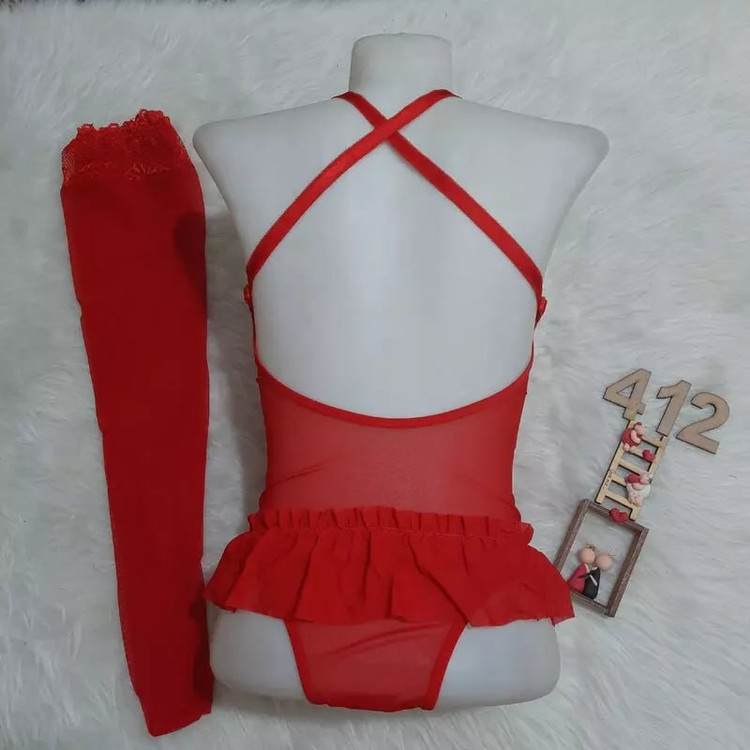 باز هم ترکیب تور و دانتل و هارنس و باز هم یک کد پرفروش دیگر! الگوی طراحی این کد با کد 411 تفاوت زیادی ندارد. هر دو برای پوشش سینهها از دانتل بهره بردهاند و یه برشِ V شکل از تور، میانتنه را میپوشاند. کد 412 برای پوششِ دور کمر یک لایه تور پرچین اضافه کرده که مدل را جذاب و متفاوت میکند. همین طور نمای پشت این مدل نسبت به کد 411 پوشش کمتری داشته و بندهای سرشانه که به شکل ضربدری بسته میشوند جذابیت نمای پشت مدل را دوچندان میکند. این مدل همراه یک جفت جوراب بالازانو عرضه میشود که آن را تکمیل کرده و زیبایی خاصی به آن میبخشد.